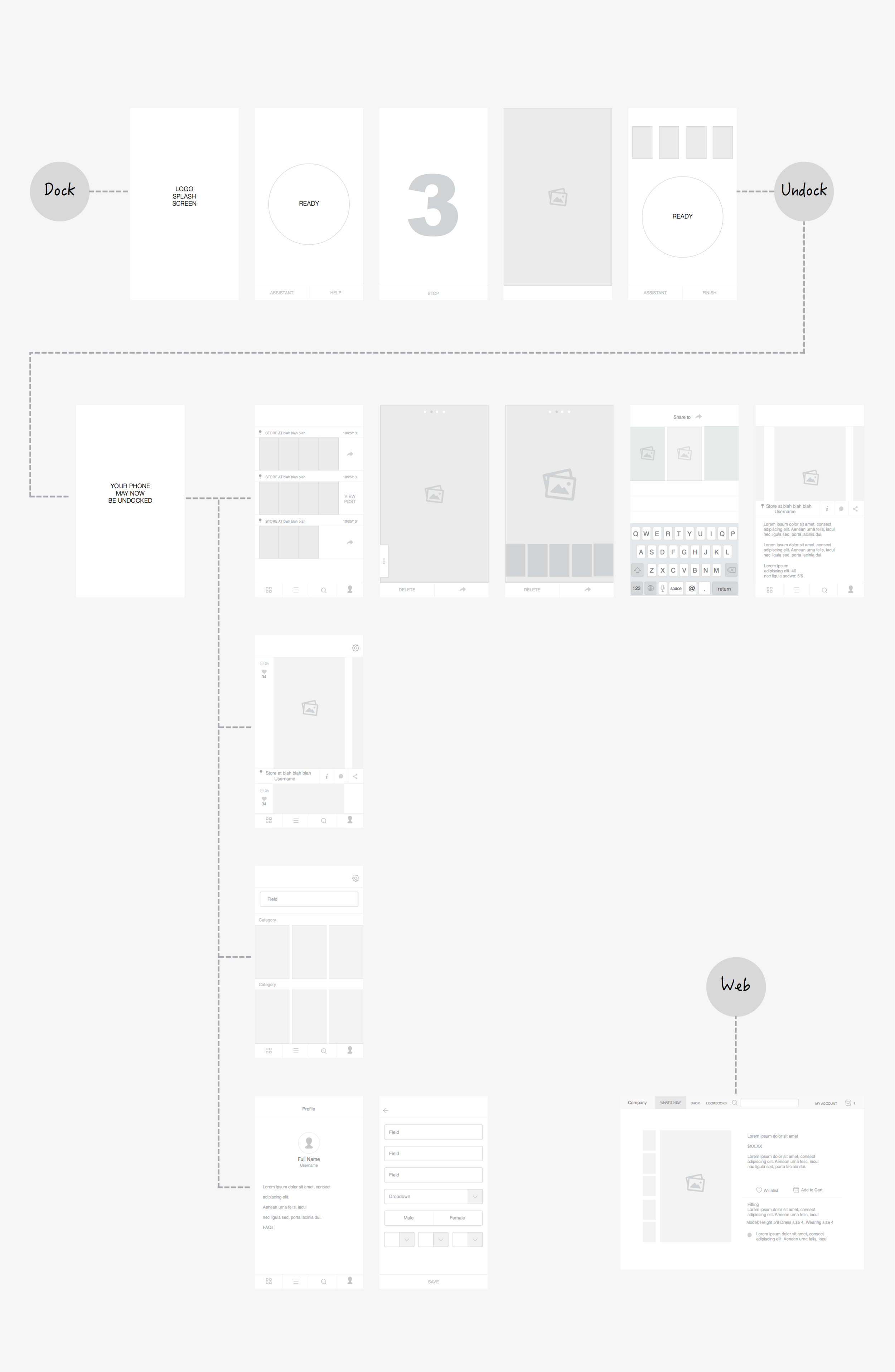 Mobile UI is kept simple. Colors and themes were chosen to appeal to women age 13-25, its initial target user segment. When docked to a photo station, the app functions as a photo booth. When undocked, it is a fashion social media app.
