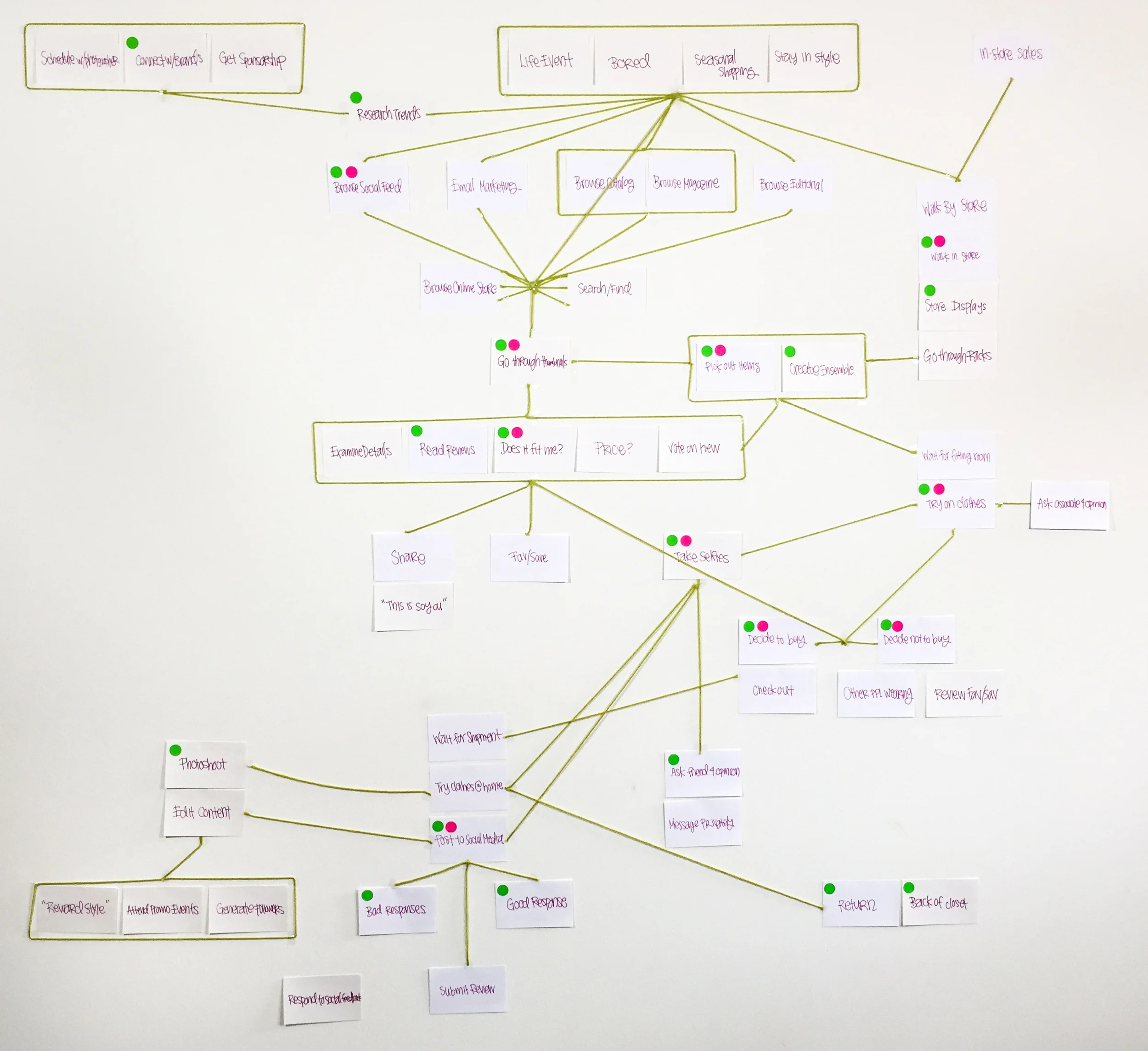 Then, I created this giant chart on the wall, mapping out the fashion retail experience. The green dots represent areas open to the most impact.